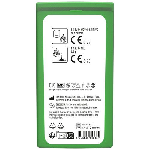 Le kit en cas de brulure à conserver dans votre sac.Contient:2 compresses pour les brulures, 1 gel pour les brulures. Tous les contenus à l'intérieur des kits sont conformes à la législation européenne. Le prix comprend l'étiquette personnalisée.