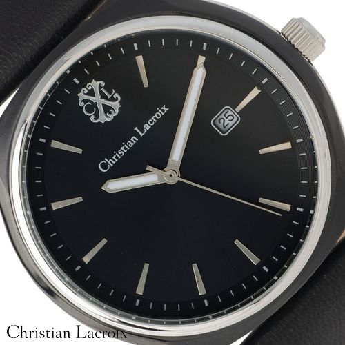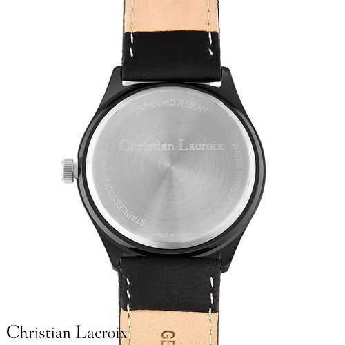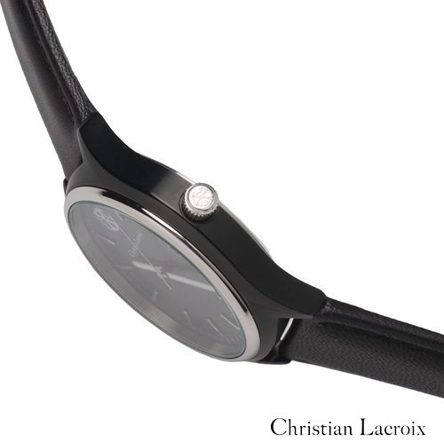 Composée d'un bracelet en cuir véritable noir souple et d'un boîtier noir en acier inoxydable, la montre dateur "More" de Christian Lacroix est moderne et masculine. Les détails chromés brillants confèrent à ce garde- temps un aspect luxueux. Mécanisme Myota - Résistance à l'eau : 5 ATM. Poids : 60 g - Dimension : Diamètre 42 mm / Bracelet : 260 mm. Livrée dans son élégant coffret noir Christian Lacroix.