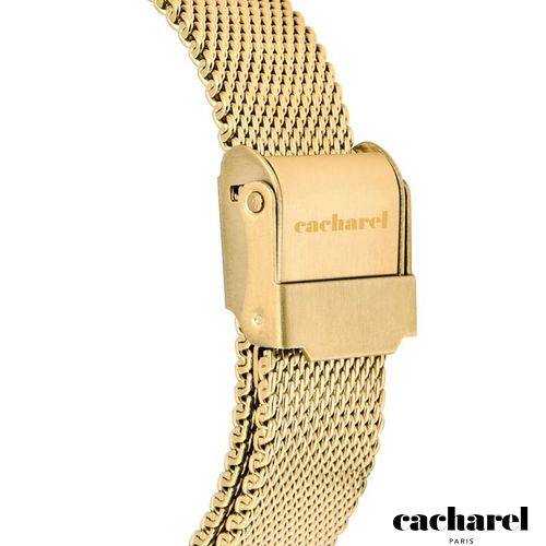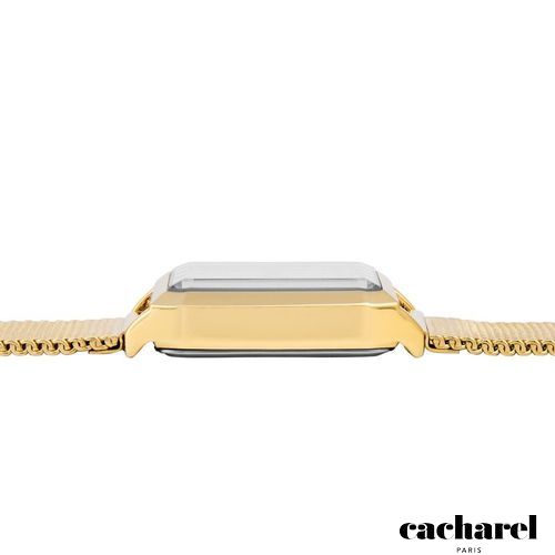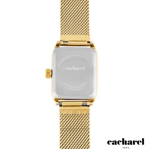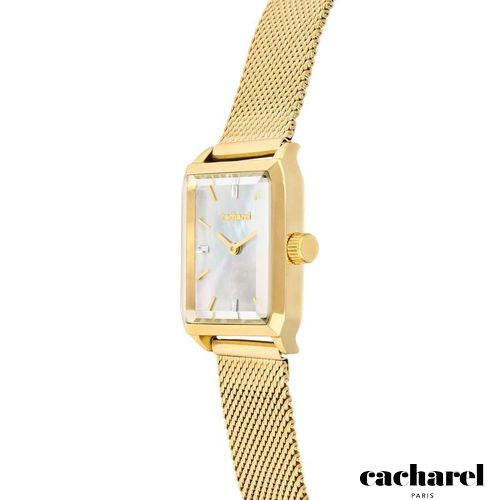 The Philomène watch in gold features a refined Milanese mesh bracelet paired with a crisp gold case, creating a sleek and timeless silhouette. Its mother- of- pearl dial is detailed entirely in gold, with a single stone adding a subtle hint of light. With its perfectly proportioned angular case, it offers an elegant and enduring sense of style.