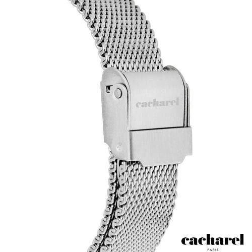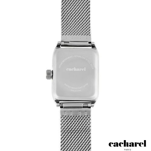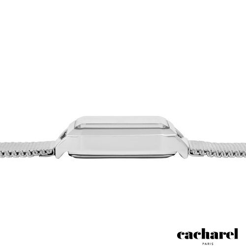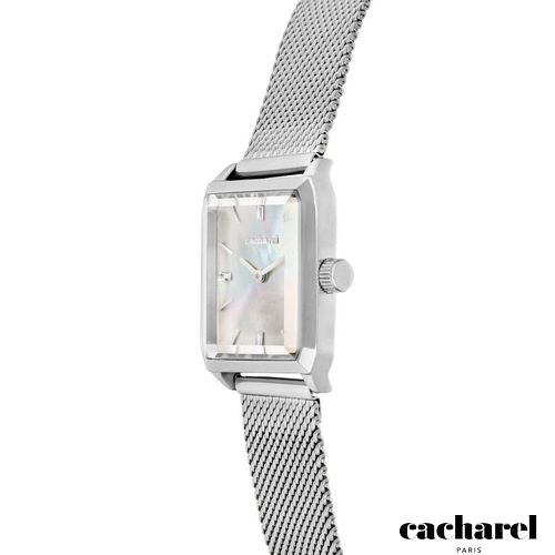 The Philomène watch in silver features a refined Milanese mesh bracelet paired with a crisp silver case, creating a sleek and timeless silhouette. Its mother- of- pearl dial is detailed entirely in silver, with a single stone adding a subtle hint of light. With its perfectly proportioned angular case, it offers an elegant and enduring sense of style.