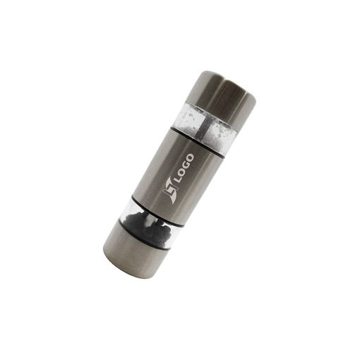 Salière - poivrière en acier inoxydable brossé. 2 compartiments à épices en acrylique. Broyeurs en céramique.