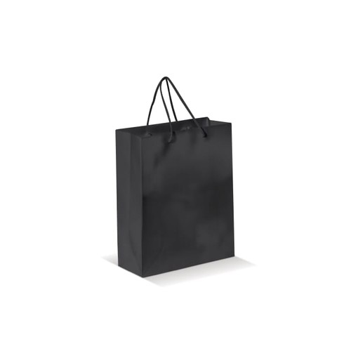 Sac de taille moyenne en papier 200 gr/m² avec anses tressées en blanc ou noir. Très résistant. Le marquage est possible sur les 2 faces. Finition brillante. Tous nos produits sont testés et certifiés, et répondent aux normes sociales.