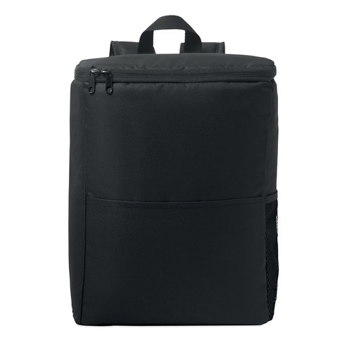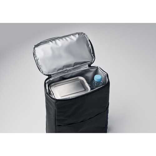 Sac à dos isotherme en polyester 600D RPET avec bandoulière réglable rembourrée, 1 poche latérale zippée en filet et 1 poche frontale. Doublure en PEVA avec mousse PE de 13 mm. Capacité 11L.