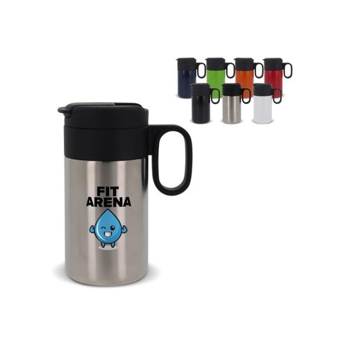 Mug isotherme double paroi sous vide de la série 'Flow' avec poignée. Le mug avec couvercle rabattable est 100% étanche et facile à transporter. Les parois intérieures et extérieures sont en acier inoxydable haute qualité. Cela maintient la boisson à la température souhaitée plus longtemps. Les boissons resteront chaudes jusqu'à 12 heures et/ou froides jusqu'à 24 heures.Matières :Acier inoxydable, PP