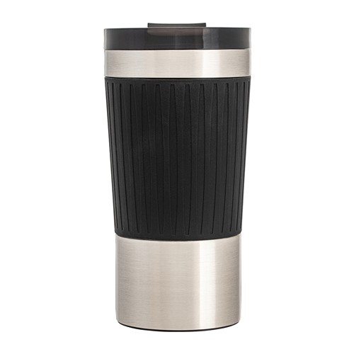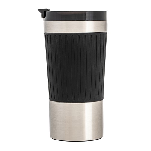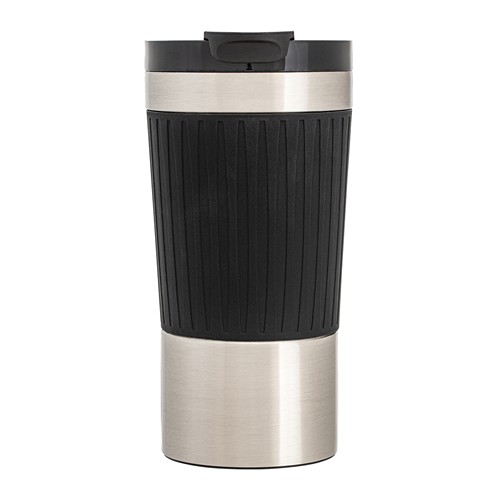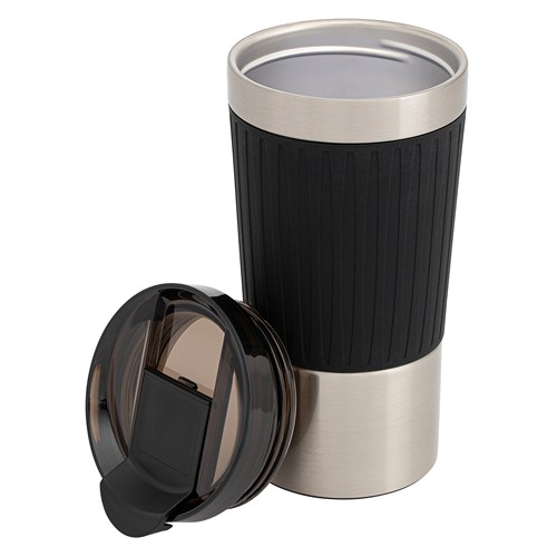 RETUMBLER- Portmore est en acier inoxydable, en AS et en plastique polypropylène, et est disponible en 4 versions : noir revêtu de poudre, blanc, gris, ou acier inoxydable avec un revêtement anti- empreintes digitales. Les variantes noires et en acier inoxydable sont équipées d'un manchon en silicone noir et d'un couvercle à charnière transparent noir. Les modèles de mugs gris clair et blanc sont dotés d'un manchon en silicone gris foncé et d'un couvercle transparent.