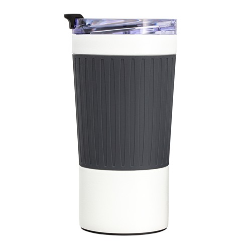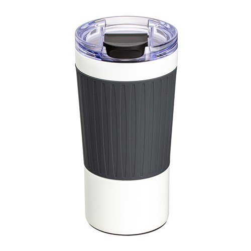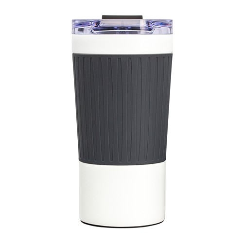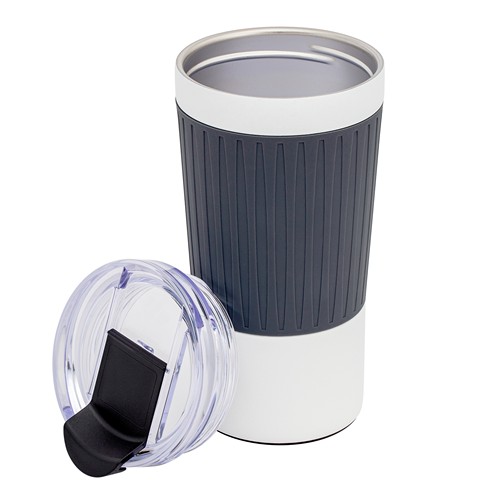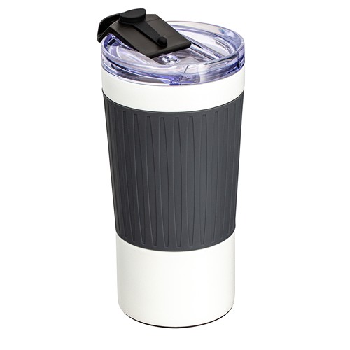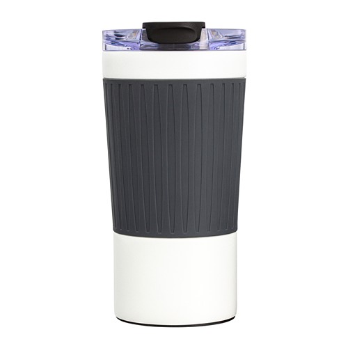 RETUMBLER- Portmore est en acier inoxydable, en AS et en plastique polypropylène, et est disponible en 4 versions : noir revêtu de poudre, blanc, gris, ou acier inoxydable avec un revêtement anti- empreintes digitales. Les variantes noires et en acier inoxydable sont équipées d'un manchon en silicone noir et d'un couvercle à charnière transparent noir. Les modèles de mugs gris clair et blanc sont dotés d'un manchon en silicone gris foncé et d'un couvercle transparent.