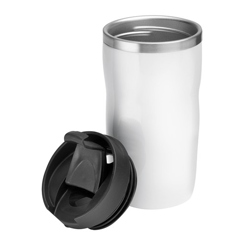 Ce mug isotherme en acier inoxydable à double paroi et manchon en plastique se prête parfaitement à une gravure laser, une impression au tampon ou UV. Le mug isolant de 290 ml tient particulièrement bien en main. Le couvercle à clapet évite les fuites.
