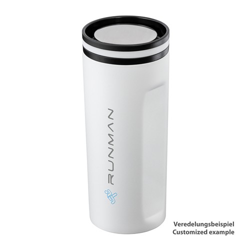 Le mug peut être marqué par une gravure au laser, une tampographie jusqu’à 2C ou une impression UV. L’acier inoxydable du couvercle 360° attirera tout particulièrement l’attention grâce avec une gravure au laser.