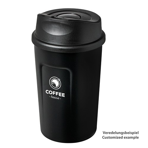 Ce gobelet isolant sous vide, à double paroi, rappelle optiquement les gobelets classiques Coffee- to- Go (café à emporter). La face extérieure est revêtue à la poudre, ce qui la rend très agréable au toucher, mais augmente également sa résistance aux rayures et aux chocs. Le couvercle est muni d’une fermeture par pression. Ce gobelet a une capacité de 380 ml, capacité idéale pour le grand café que l’on prend le matin pour commencer la journée.