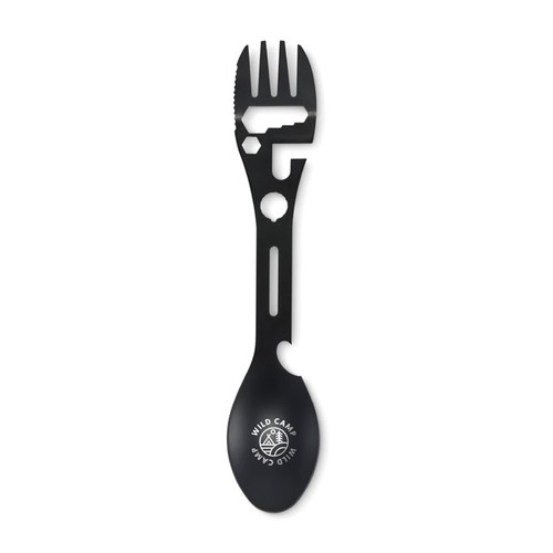 Coutellerie multitool en acier inoxydable. Les outils comprennent une cuillère, une fourchette, une clé à molette, un décapsuleur, une clé hexagonale, un couteau dentelé, un ouvre- boîte.