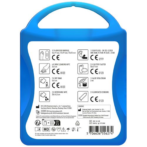 Le kit pratique pour les festivals. Contient: 12 pansements, 4 cotons pour nettoyer la peau, 2 cotons secs, 2 lingettes rafraichissantes, 2 préservatifs, 2 pansements, 1 crème aloe vera, 2 bouchons anti bruit. Tous les contenus à l'intérieur des kits sont conformes à la législation européenne. Le prix comprend l'étiquette personnalisée.