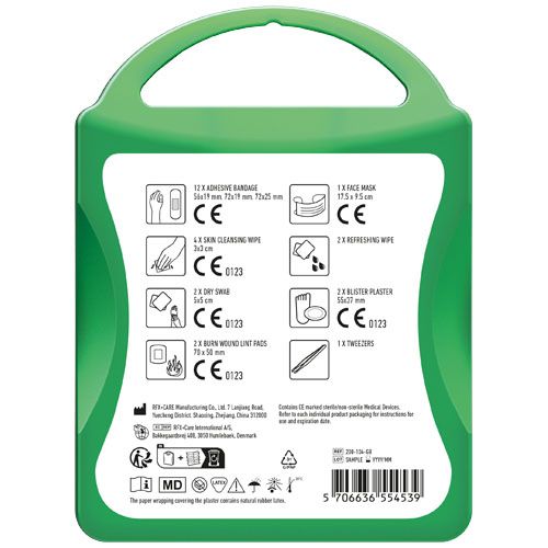 Le kit idéal sur votre lieu de travail. Ce kit devrait être sur tous les lieux de travail pour traiter les petites blessures et les urgences. Contient: 12 pansements,4 cotons pour nettoyer la peau, 2 cotons secs, 1 Masque, 2 pansements, 2 compresses pour les brulures, 2 compresses pour les brulures, 1 pince à épiler. Tous les contenus à l'intérieur des kits sont conformes à la législation européenne. Le prix comprend l'étiquette personnalisée.
