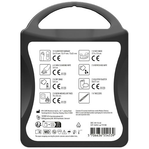 Le kit idéal sur votre lieu de travail. Ce kit devrait être sur tous les lieux de travail pour traiter les petites blessures et les urgences. Contient: 12 pansements,4 cotons pour nettoyer la peau, 2 cotons secs, 1 Masque, 2 pansements, 2 compresses pour les brulures, 2 compresses pour les brulures, 1 pince à épiler. Tous les contenus à l'intérieur des kits sont conformes à la législation européenne. Le prix comprend l'étiquette personnalisée.