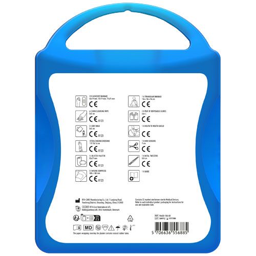Le kit premiers secours complet est un indispensable à la maison pour pouvoir intervenir en cas de blessures. Contient:1 notice premiers secours, 1 pansement, 12 pansements, 1 pince à épiler métal, 1 paire de ciseaux, 1 bandage triangulaire, 1 paire de gants jetables, 2 compresses, 1 pansement stérile, 2 cotons secs, 4 coton nettoyant. Tous les contenus à l'intérieur des kits sont conformes à la législation européenne. Le prix comprend l'étiquette personnalisée.