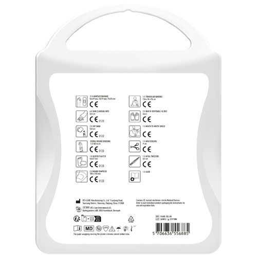Le kit premiers secours complet est un indispensable à la maison pour pouvoir intervenir en cas de blessures. Contient:1 notice premiers secours, 1 pansement, 12 pansements, 1 pince à épiler métal, 1 paire de ciseaux, 1 bandage triangulaire, 1 paire de gants jetables, 2 compresses, 1 pansement stérile, 2 cotons secs, 4 coton nettoyant. Tous les contenus à l'intérieur des kits sont conformes à la législation européenne. Le prix comprend l'étiquette personnalisée.