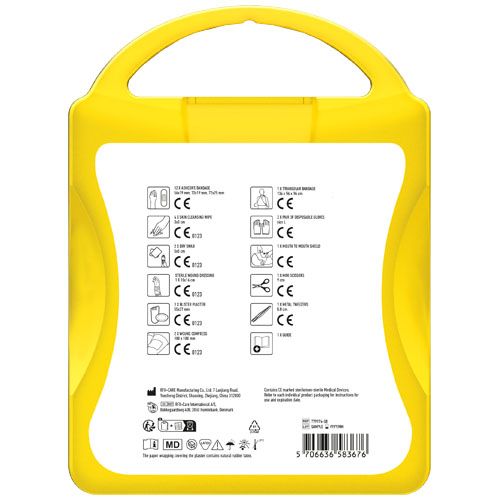 Le kit premiers secours complet est un indispensable à la maison pour pouvoir intervenir en cas de blessures. Contient:1 notice premiers secours, 1 pansement, 12 pansements, 1 pince à épiler métal, 1 paire de ciseaux, 1 bandage triangulaire, 1 paire de gants jetables, 2 compresses, 1 pansement stérile, 2 cotons secs, 4 coton nettoyant. Tous les contenus à l'intérieur des kits sont conformes à la législation européenne. Le prix comprend l'étiquette personnalisée.