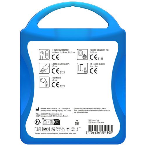 Ce kit premiers secours est très utile à la maison ou dans la voiture pour parer aux urgences. Contient: 12 pansements, 4 cotons pour nettoyer la peau,2 cotons secs, 1 bandage élastique, 2 compresses pour les brulures. Tous les contenus à l'intérieur des kits sont conformes à la législation européenne. Le prix comprend l'étiquette personnalisée.