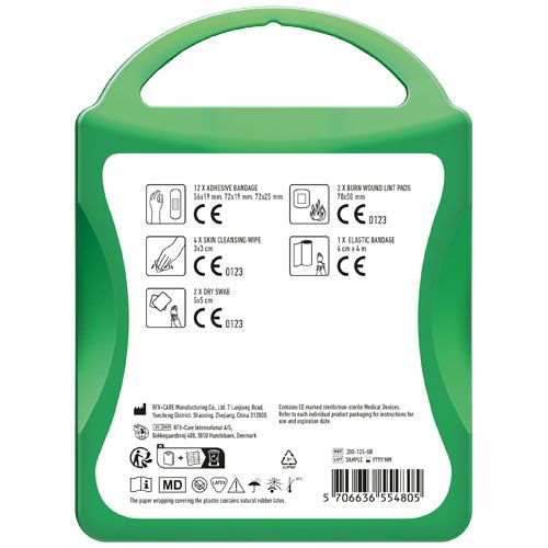 Ce kit premiers secours est très utile à la maison ou dans la voiture pour parer aux urgences. Contient: 12 pansements, 4 cotons pour nettoyer la peau,2 cotons secs, 1 bandage élastique, 2 compresses pour les brulures. Tous les contenus à l'intérieur des kits sont conformes à la législation européenne. Le prix comprend l'étiquette personnalisée.