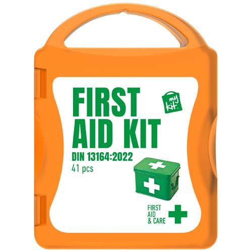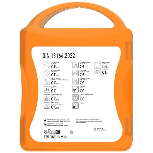 Le kit premiers secours complet pour la voiture approuvé DIN. Contient: 3 pansements de premiers secours 8 mx 10 cm, 1 pansement de premiers secours 10 mx 12 cm, 2 pansements pour brulure 40 x 60 cm, 1 pansement pour brulure 60 x 80 cm, 3 compresses enroulées, 2 bandages élastiques 4 mx 6 cm, 3 élastiques 2 pansements adhésifs, 2 paires de gants jetables, 2 bandages triangulaires, 1 couverture de survie, 2 cotons pour nettoyer la peau, 2 pansements de doigts 70 x 40 mm, 2 pansements 120 x 20 mm, 2 pansements 72 x 19 mm.Tous les contenus à l'intérieur des kits sont conformes à la législation européenne. Le prix comprend l'étiquette personnalisée.
