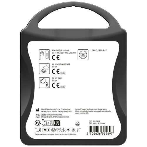 Le kit de réparation nécessaire pour le vélo et ses produits premiers secours. Contient:12 pansements, 4 cotons pour nettoyer la peau, 2 cotons secs, 1 kit de réparation. Tous les contenus à l'intérieur des kits sont conformes à la législation européenne. Le prix comprend l'étiquette personnalisée.