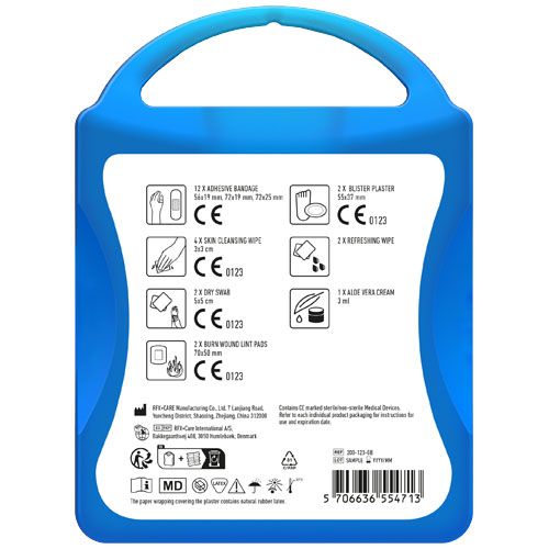 Le kit idéal pour les voyageurs. Contient: 12 pansements, 4 cotons pour nettoyer la peau, 2 cotons secs, 2 compresses pour les brulures, 1 pansement, 2 lingettes rafraichissantes, 1 crème aloe vera.Tous les contenus à l'intérieur des kits sont conformes à la législation européenne. Le prix comprend l'étiquette personnalisée.