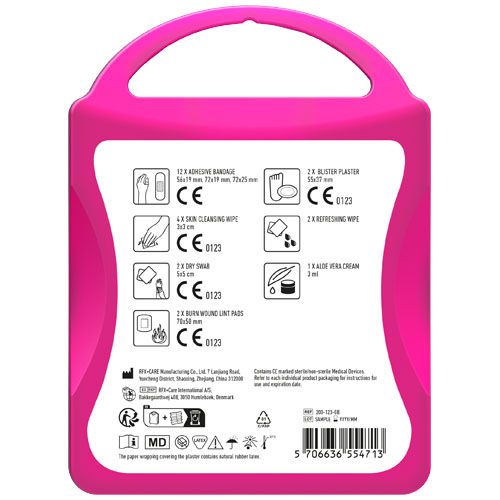 Le kit idéal pour les voyageurs. Contient: 12 pansements, 4 cotons pour nettoyer la peau, 2 cotons secs, 2 compresses pour les brulures, 1 pansement, 2 lingettes rafraichissantes, 1 crème aloe vera.Tous les contenus à l'intérieur des kits sont conformes à la législation européenne. Le prix comprend l'étiquette personnalisée.