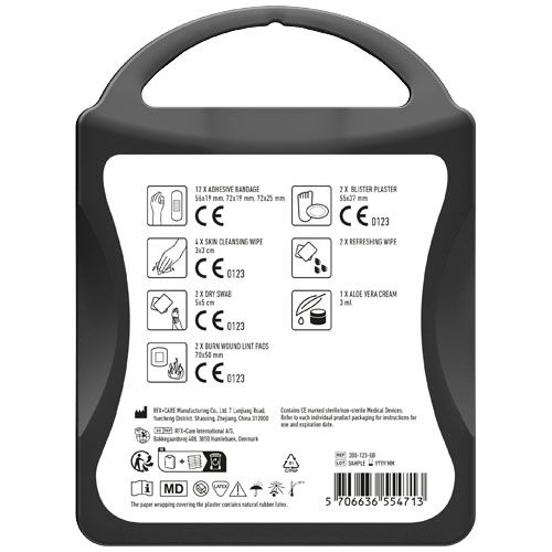 Le kit idéal pour les voyageurs. Contient: 12 pansements, 4 cotons pour nettoyer la peau, 2 cotons secs, 2 compresses pour les brulures, 1 pansement, 2 lingettes rafraichissantes, 1 crème aloe vera.Tous les contenus à l'intérieur des kits sont conformes à la législation européenne. Le prix comprend l'étiquette personnalisée.