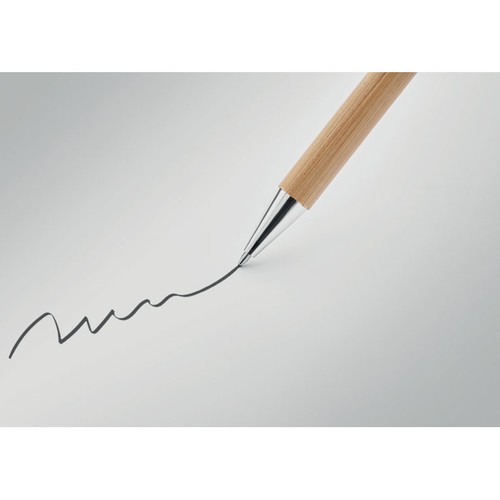 Stylo bille twist en bambou avec embout métallique. Encre bleue. Le bambou est un produit naturel, et présente de légères variations de couleur, de décoration et de tailles. FSC®- certified | FSC 100%, N5.7, FSC- C213206
