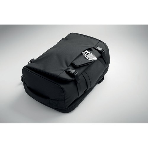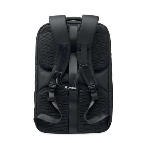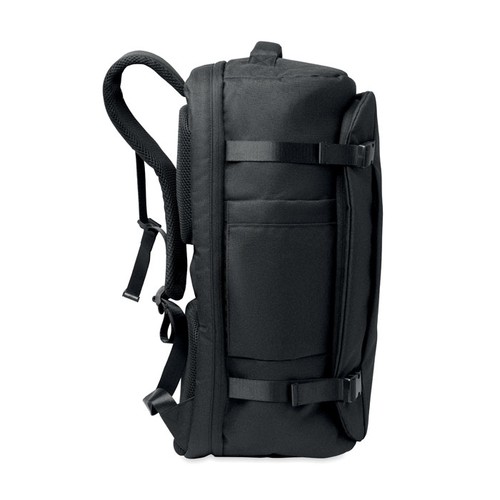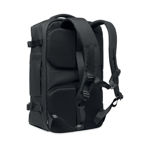 Grand sac à dos de voyage pour ordinateur portable 17 '' en polyester 600D RPET. Plusieurs compartiments : compartiment principal pour les vêtements, 2 compartiments matelassés pour l'ordinateur portable et tablette. Panneau arrière renforcé, bandoulière, poignée.