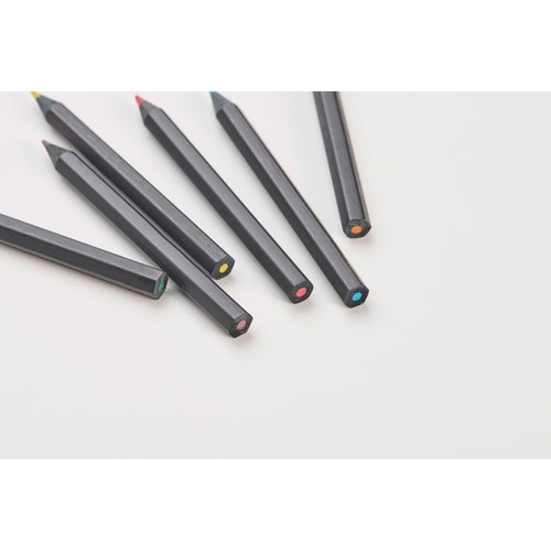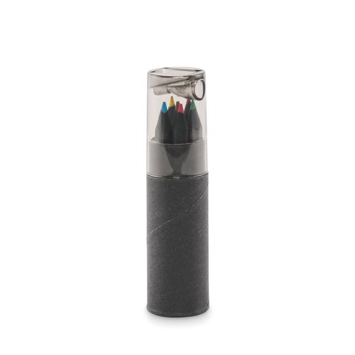 Tube en papier noir contenant 6 crayons de couleur et un taille- crayon intégré dans le capuchon.