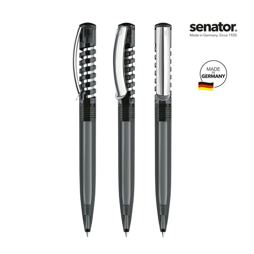 Stylo à bille rétractable avec corps en plastique transparent et clip en métal.