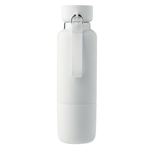 Bouteille isotherme à double paroi en acier inoxydable recyclé (90 %) et en acier inoxydable (10 %), avec poignée intégrée et longue sangle supplémentaire (70 cm) dans le couvercle en PP. Anti fuite. Gobelet inclus. Capacité 500 ml.