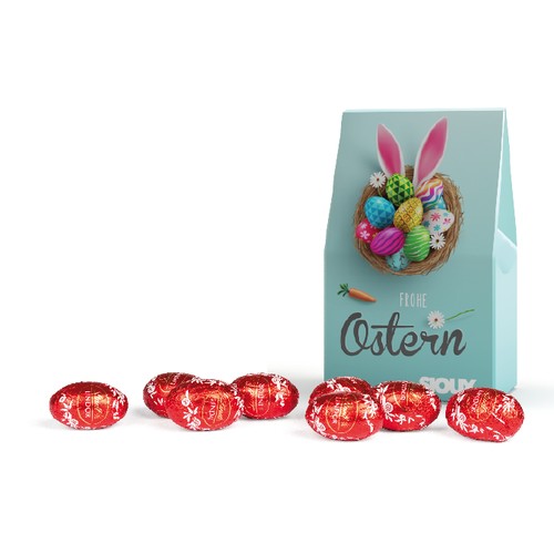 Les oeufs de Pâques Lindt Lindor les plus fi ns, en chocolat au lait fondant, présentés dans une pochette en carton rigide personnalisable, fabriquée en matériau certifi é FSC® —