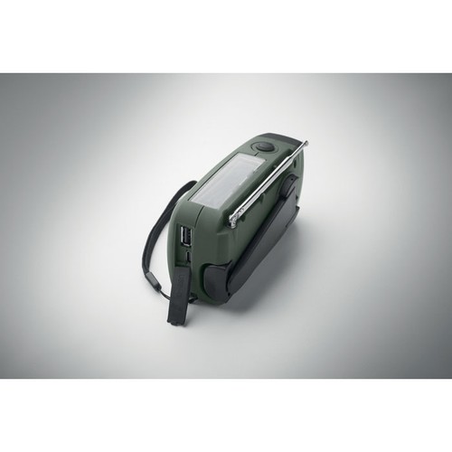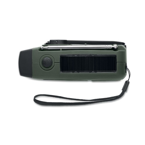 Radio AM/FM portable en ABS avec torche LED (2 réglages) et un Powerbank 1200mAh pour la recharge d'urgence. Alimentée par énergie solaire et par manivelle.