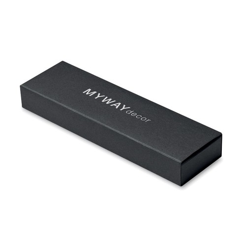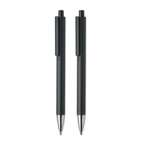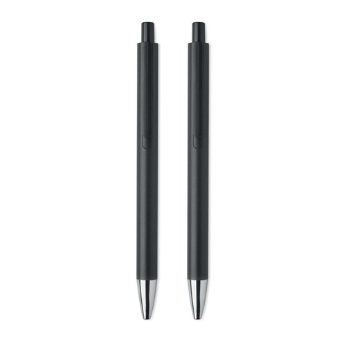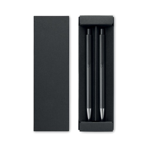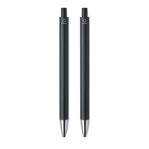 Parure de stylos en aluminium recyclé comprenant 1 stylo bille à poussoir (encre bleue) et 1 stylo graphite sans encre. Présentée dans une boîte en papier recyclé.