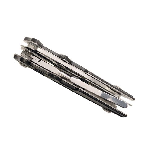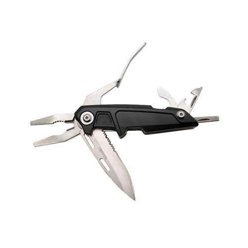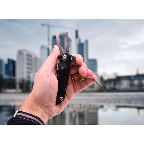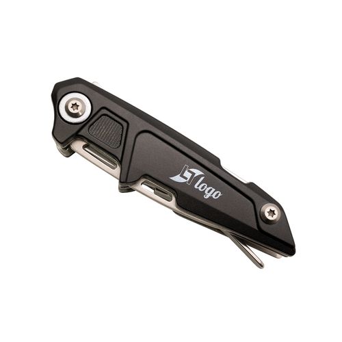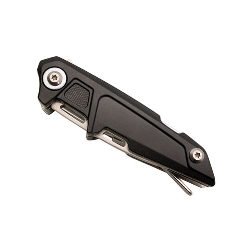 Outil multifonctions professionnel en acier inoxydable hautement résistant (2CR13). Manche en aluminium. Assemblage vissé Torx. 17 fonctions : pince, pince coupante, couteau, décapsuleur, ouvre- boîte, 2 tailles de tournevis plat, assortiment de 9 outils (tournevis cruciformes, plats, clés Allen), dénudeur. Dureté rockwell : 48 degrés. Multi outil livré dans un étui gris chiné en RPET.