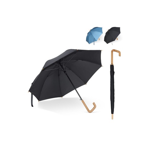 Parapluie bâton en R- PET avec une poignée en crochet en bois au design emblématique. Grâce au cadre en fibre de verre, le parapluie est résistant aux tempêtes. Les embouts sont en bambou et la tige est en métal pour un meilleur recyclage et le matériau chiné donne au parapluie un aspect luxueux (le noir est de couleur unie).