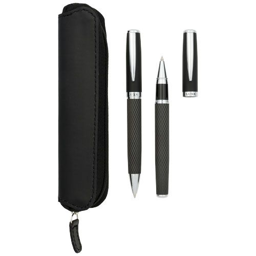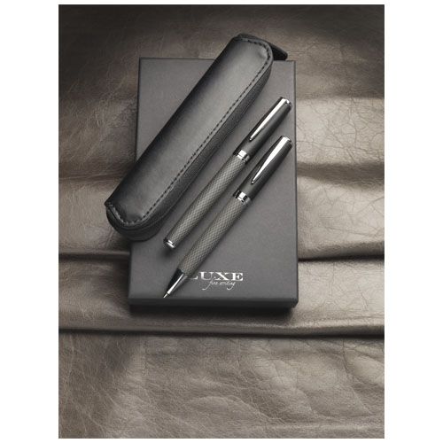 Pour une différence subtile en noire, ce lot au design exclusif composé d'un stylo à bille et d'un stylo roller a une finition imprimée en fibre de carbone. Pochette de protection de qualité incluse, emballage dans une boîte cadeau « LUXE ».