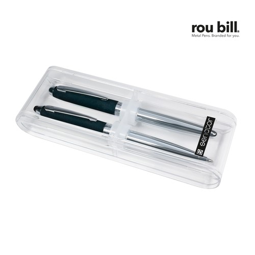 Parure Stylo à bille et roller avec corps en métal chromé brillant et laque souple. Attributs en métal chromé brillants. Capuchon compatible écran sur stylos bille. Recharge métal super grande capacité, type G2 et recharge roller, écriture bleue.