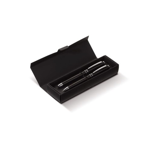 Set d'écriture métal avec ce stylo bille et stylo roller. Stylo bille avec mécanisme twist. Stylo roller avec capuchon.