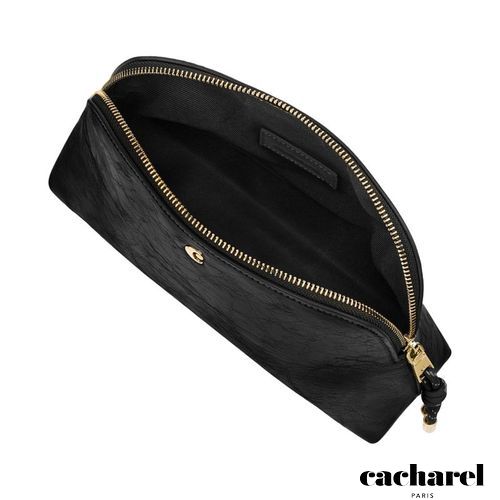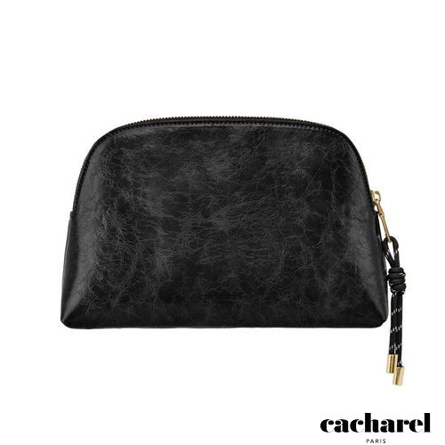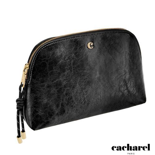 The Philomene cosmetic pouch combines elegance with a bold, contemporary attitude. Crafted from a glazed, crinkled leather- like texture, it is signed with the signature Cacharel C plate and refined gold trims, creating a look that feels both modern and sophisticated. Its roomy shape allows for generous storage, making it ideal for carrying a wide selection of beauty or travel essentials. The design is completed with a distinctive cord zipper puller for a fashion- forward touch and a small Cacharel PU tag inside as a subtle signature detail. Available in black, camel, and burgundy.