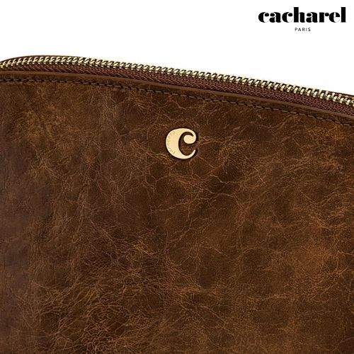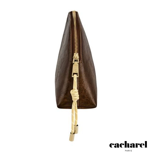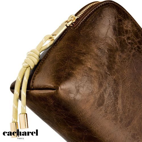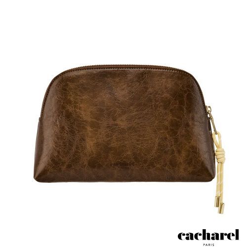 The Philomene cosmetic pouch combines elegance with a bold, contemporary attitude. Crafted from a glazed, crinkled leather- like texture, it is signed with the signature Cacharel C plate and refined gold trims, creating a look that feels both modern and sophisticated. Its roomy shape allows for generous storage, making it ideal for carrying a wide selection of beauty or travel essentials. The design is completed with a distinctive cord zipper puller for a fashion- forward touch and a small Cacharel PU tag inside as a subtle signature detail. Available in black, camel, and burgundy.