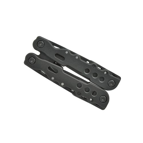 Pince multifonctions pliante professionnelle en acier inoxydable hautement résistant (2CR13). Manche en acier inoxydable. Blocage de sécurité nouvelle génération (déblocage facile). Assemblage vissé Torx. 12 fonctions : pince universelle, pince coupante, couteau, scie, lime, décapsuleur, ouvre boîte, tournevis cruciforme, 3 tailles de tournevis plat, poinçon. Dureté rockwell : 48 degrés. Multi outil livré dans un étui de ceinture en nylon noir.