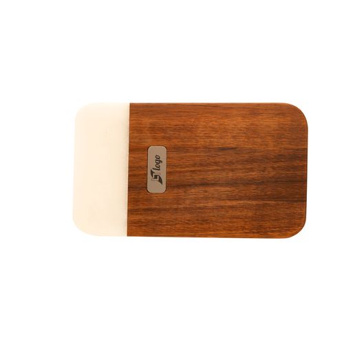 Acacia massif et marbre blanc. Plaque en métal finition titane. Peut aussi servir comme planche de présentation.