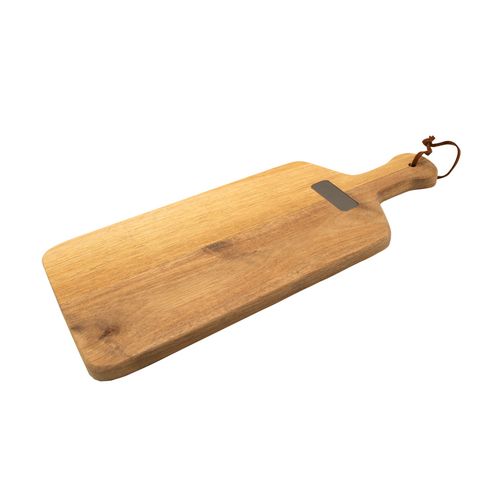 Acacia massif. Plaque en métal finition titane. Lien en similicuir. Peut aussi servir comme planche de présentation.