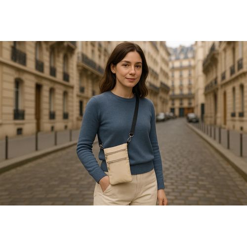 En polycoton 160g/m². 4 espaces de rangement avec fermeture zippée dont l'un en maille permettant de voir directement le contenu. 2 espaces complémentaires dont l'un sur l'extérieur prévu pour accueillir un smartphone. Rabat maintenu par un bouton pression. Intérieurs entièrement doublés. Bandoulière en nylon.
