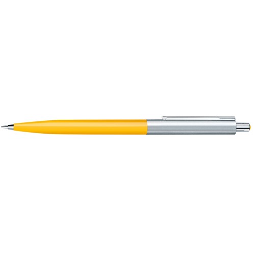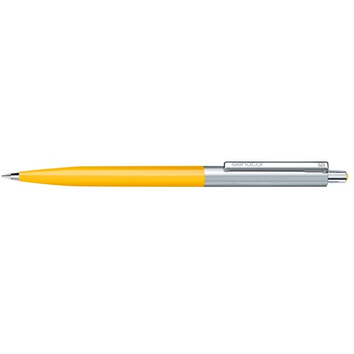 Stylo à bille rétractable.Surface du corps opaque brillante,partie supérieure en métal, attributs en métal, poussoir avec décor en matière plastique colorée.