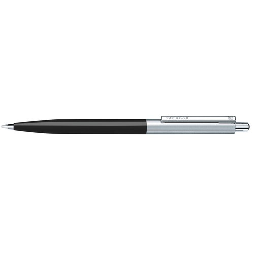 Stylo à bille rétractable.Surface du corps opaque brillante,partie supérieure en métal, attributs en métal, poussoir avec décor en matière plastique colorée.