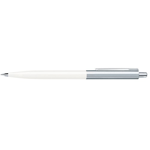 Stylo à bille rétractable.Surface du corps opaque brillante,partie supérieure en métal, attributs en métal, poussoir avec décor en matière plastique colorée.