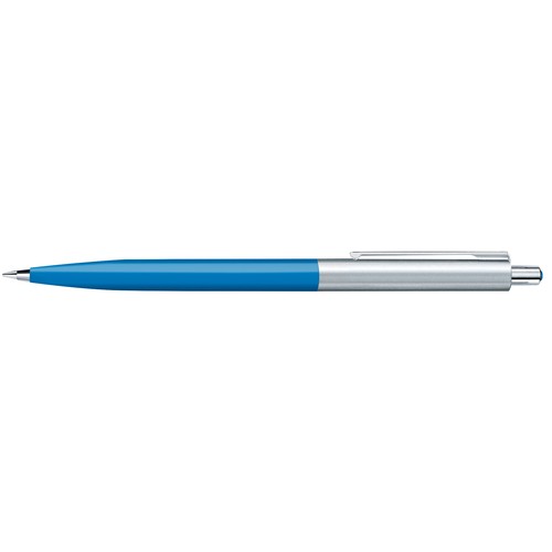 Stylo à bille rétractable.Surface du corps opaque brillante,partie supérieure en métal, attributs en métal, poussoir avec décor en matière plastique colorée.